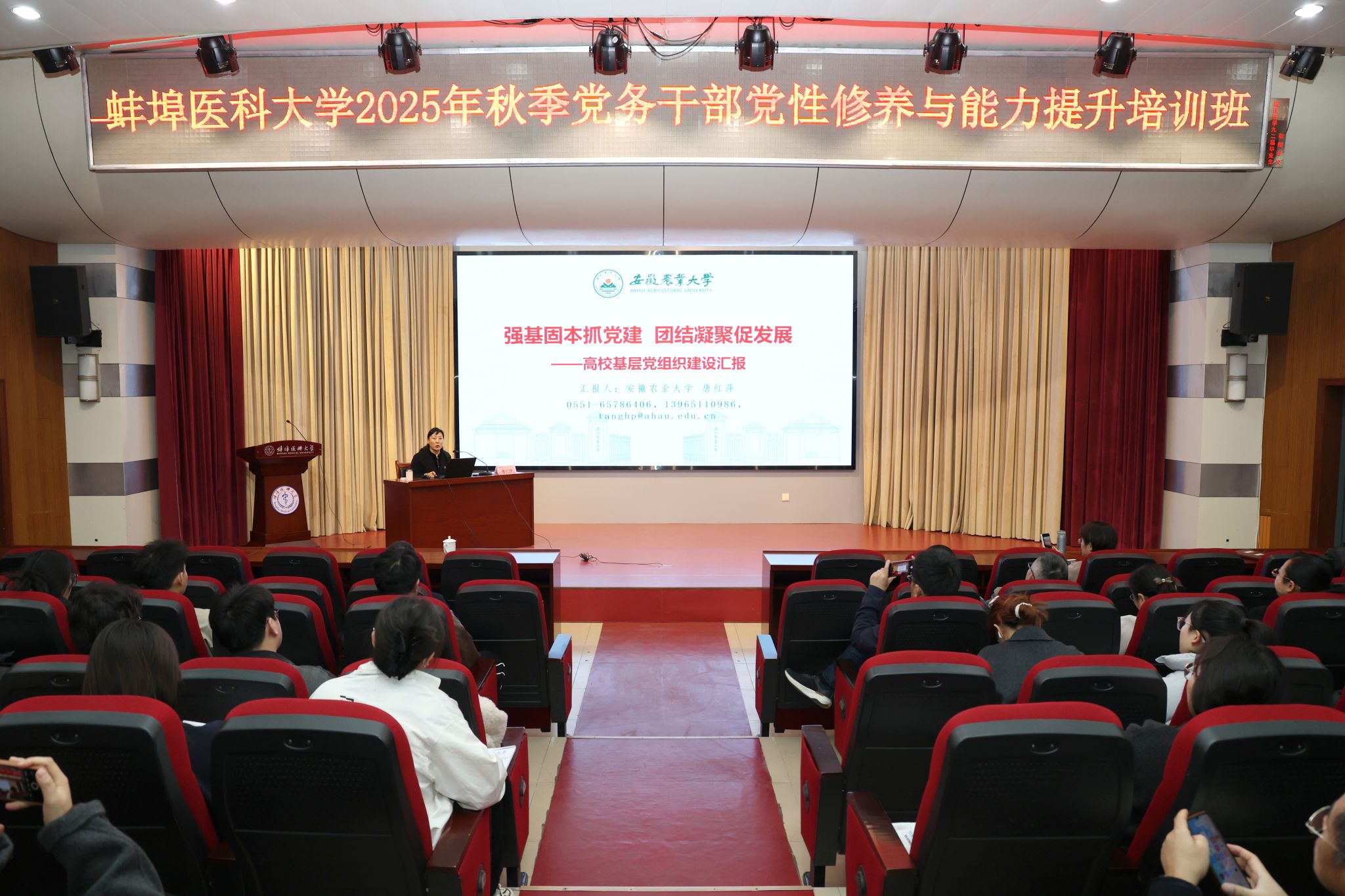 安徽农业大学党委研究生工作部部长唐红萍以《强基固本抓党建,团结凝聚促发展》为题作首场辅导报告;第四批全国样板党支部(第一临床医学院学生第六党支部)书记尹晓娟围绕支部创建工作,分享经验、展示成果;党委组织部就发展党员和基层党务工作作专题培训。